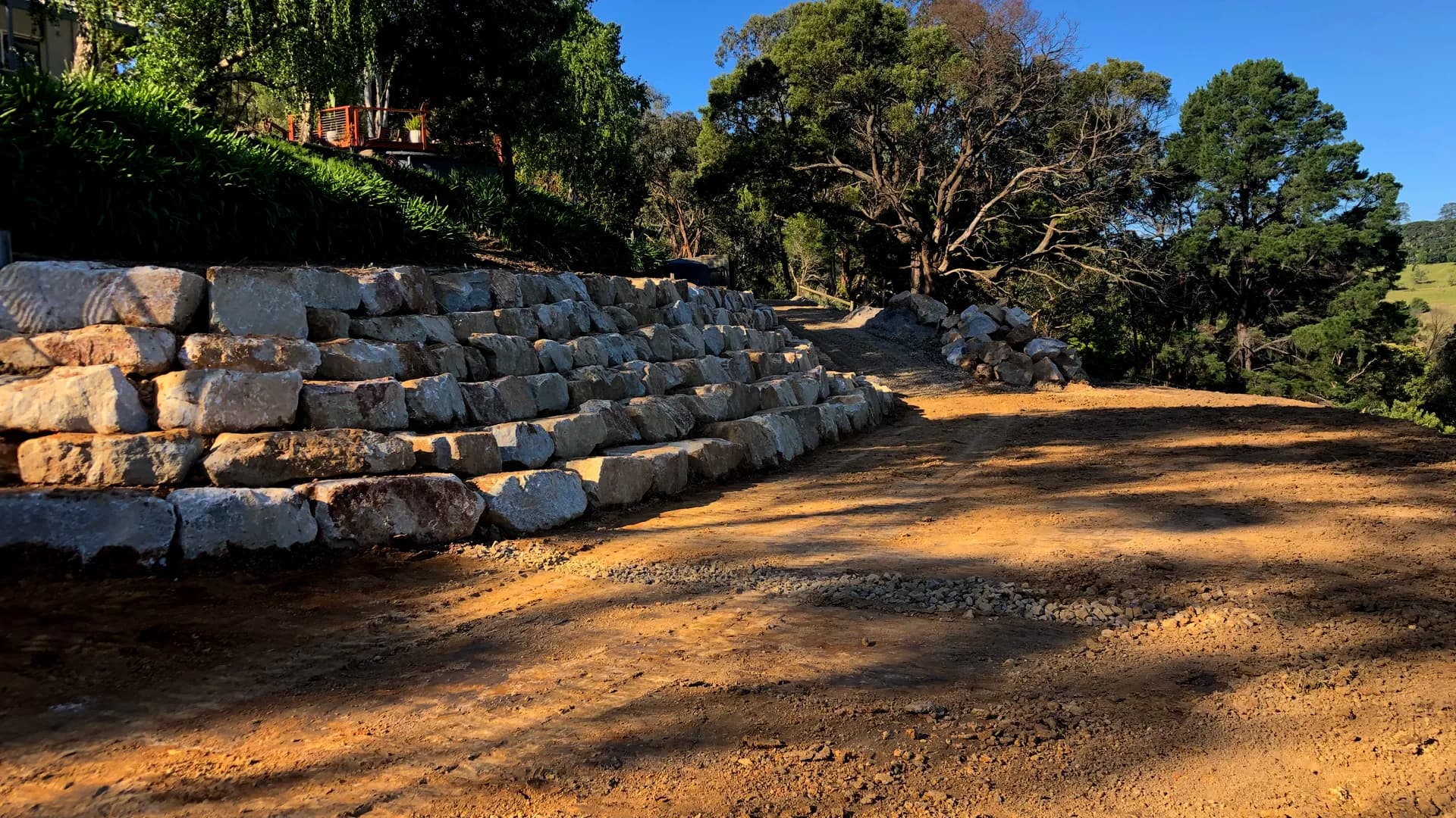 Retaining walls engineered to AS4678. Excavation on blocks other contractors refuse to quote. Drainage designed for 1,400 mm of annual rainfall. CFA compliant access tracks. All from one operator who lives in the hills and works them every day.